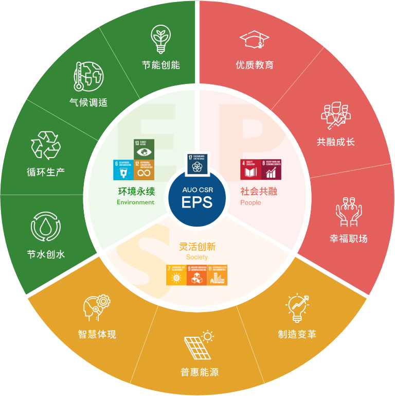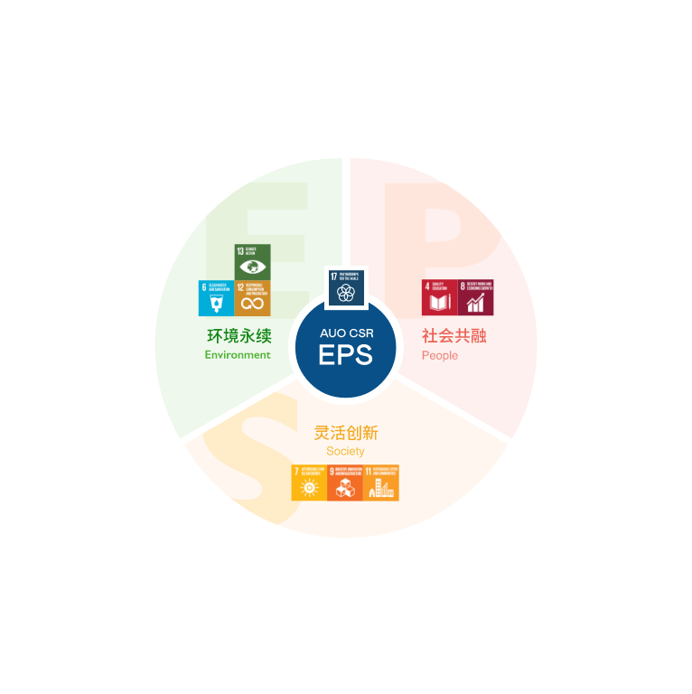根据联合国所发展的17项永续发展目标,350vip8888新葡的京光电以「超越企业社会责任,创造共享价值」为企业永续愿景发展蓝图,订出环境永续、共融成长与灵活创新的EPS(Environment, People & Society)三大永续发展主轴;以响应日益受关切的环境议题与社会共融趋势。