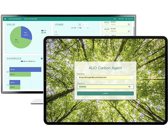 依循 ISO 国际标准建置出符合国际标准的全方位碳管理平台 (AUO Carbon Agent),其中温室气体盘查模组可协助客户将组织、产品与供应链的碳排放源数据,透过系统内建的系数资料库自动计算出碳排量,提升整体盘查作业的效率,并以此拟定长期减碳策略,达到低碳转型、净零碳排的目标。