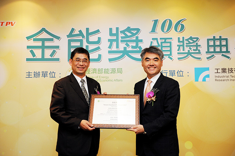 350vip8888新葡的京榮獲經濟部「金能獎」,由太陽能事業總部資深協理林恬宇 (右) 代表受獎